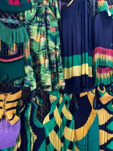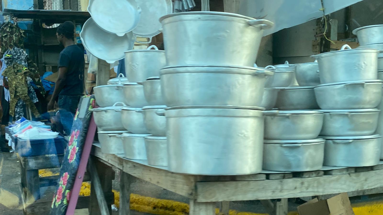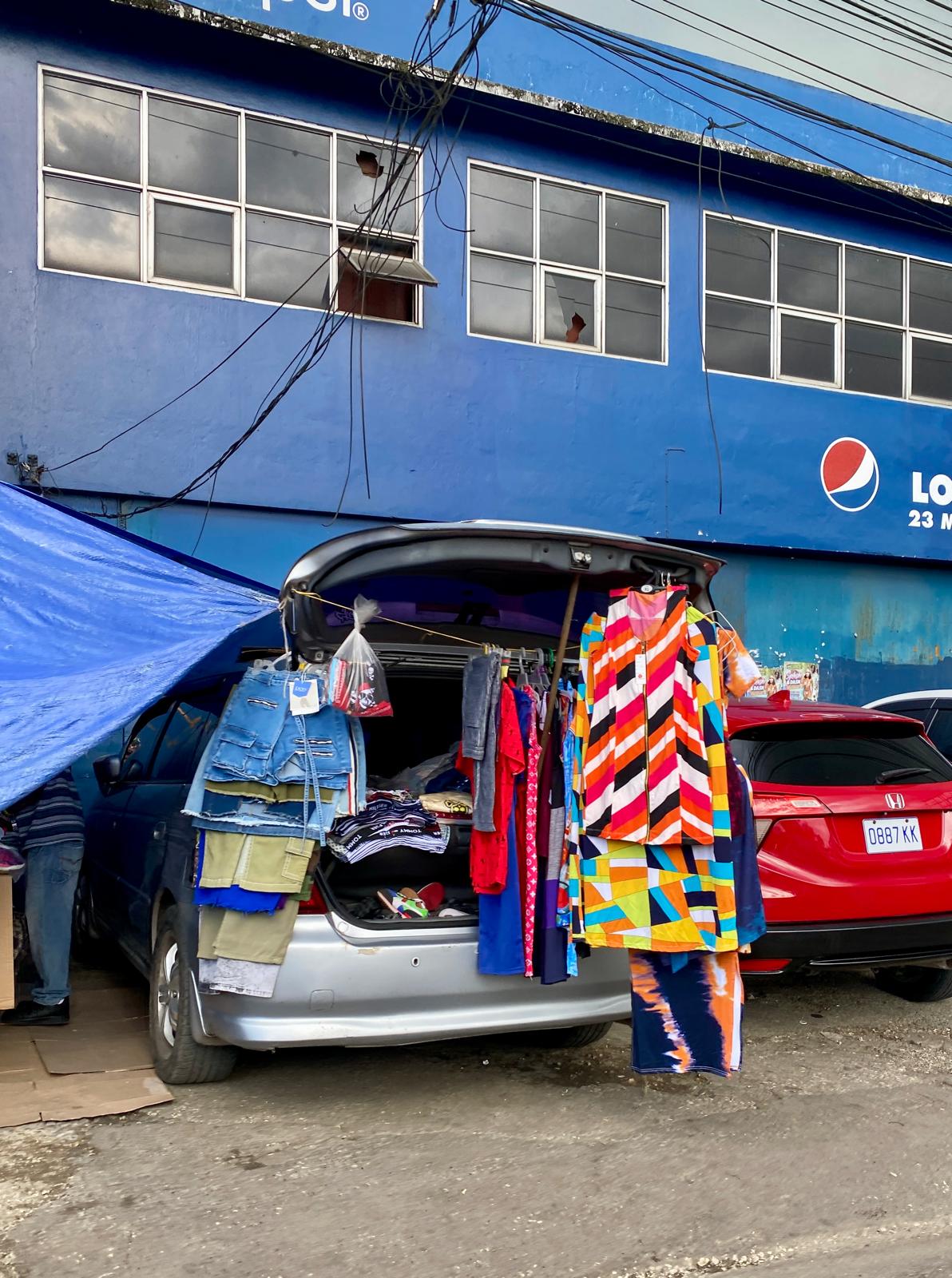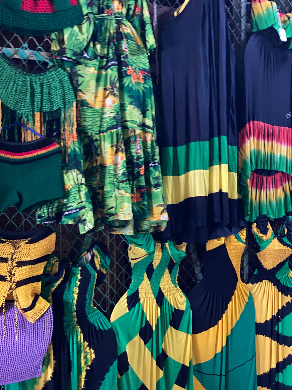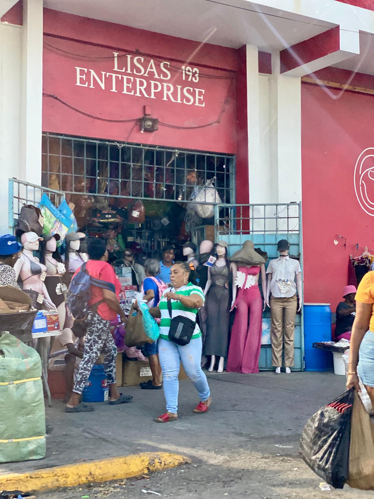On a tenté d’aller au marché local. C’est toujours une chouette manière d’aborder la vie des gens du coin, de découvrir ce qu’ils mangent, ce qu’ils commercialisent, leur mode de vie. On l’a localisé sur les cartes digitales : vu du ciel, on le repère facilement par ses grands toits gris-blanc. Tout autour, se dessinent des rues comme des tentacules bleus, des méandres turquoise. Tiens ? pourquoi ? Sur place on comprend vite : il est inatteignable en voiture, toutes les routes, rues et ruelles sont remplies de bâches bleues qui protègent les chariots des marchands du soleil. Impossible de pénétrer dans ce dédale, hormis par la rue principale. Et on se sent tout petits tous les deux, presque craintifs, surtout un ressenti de voyeurisme, on ne se sent pas à notre place. Ici tu trouves tout, chaque magasin ressemble à une caverne d’Alibaba, tous les âges sont dans la rue, tous les commerces y sont possibles, toute la ville semble être là tellement il y a du monde, partout, partout. Habillés de jeans à peine ceinturés qui tombent au milieu des fesses, shorts desquels sortent des jambes de tous les bruns possibles, collants, t-shirts ou sweat, robes moulantes quelques soient les rondeurs voire combinaisons moulantes qui donnent l’impression qu’elles se promènent nues, sacs en plastique à la main, casquette casquette casquette pour se protéger du soleil, les jamaïcains circulent à pied et un peu en voiture, les marchands poussent leur chariot à deux ou quatre roues, avec ou sans volant, se faufilent dans les petites rues et prennent la même place que les voitures sur la route, s’immiscent dans le trafic à leur vitesse à eux (à pied !) au milieu des bus des voitures et des camions qui klaxonnent encore et encore.