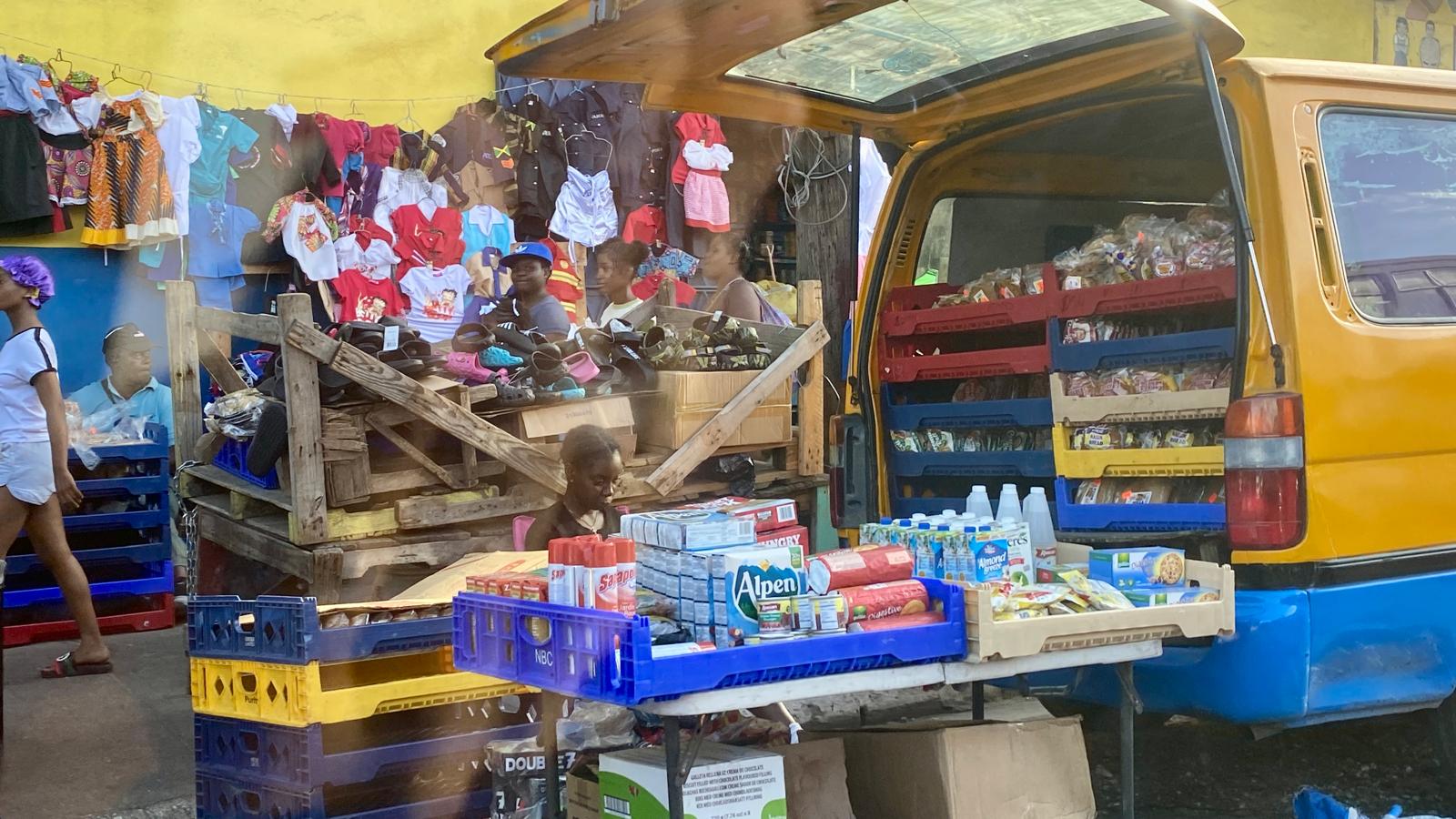 Des viandes congelées, avec beaucoup d’os, des poissons congelés du Vietnam, des crevettes congelées elles-aussi avec plein de glace autour d’elles (miam le respect de la chaîne du froid), des pains mous comme des burgers, des pattes de poulet, des produits « Swiss » comme du chocolat chaud aux mashmallows, des épices, des biscuits sucrés très sucrés, des biscuits salés sucrés, des sodas en veux-tu en voilà … et de la bonne farine jamaïcaine, blanche et bise, qu’ils exportent facilement.