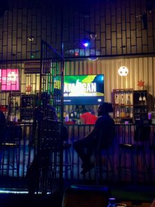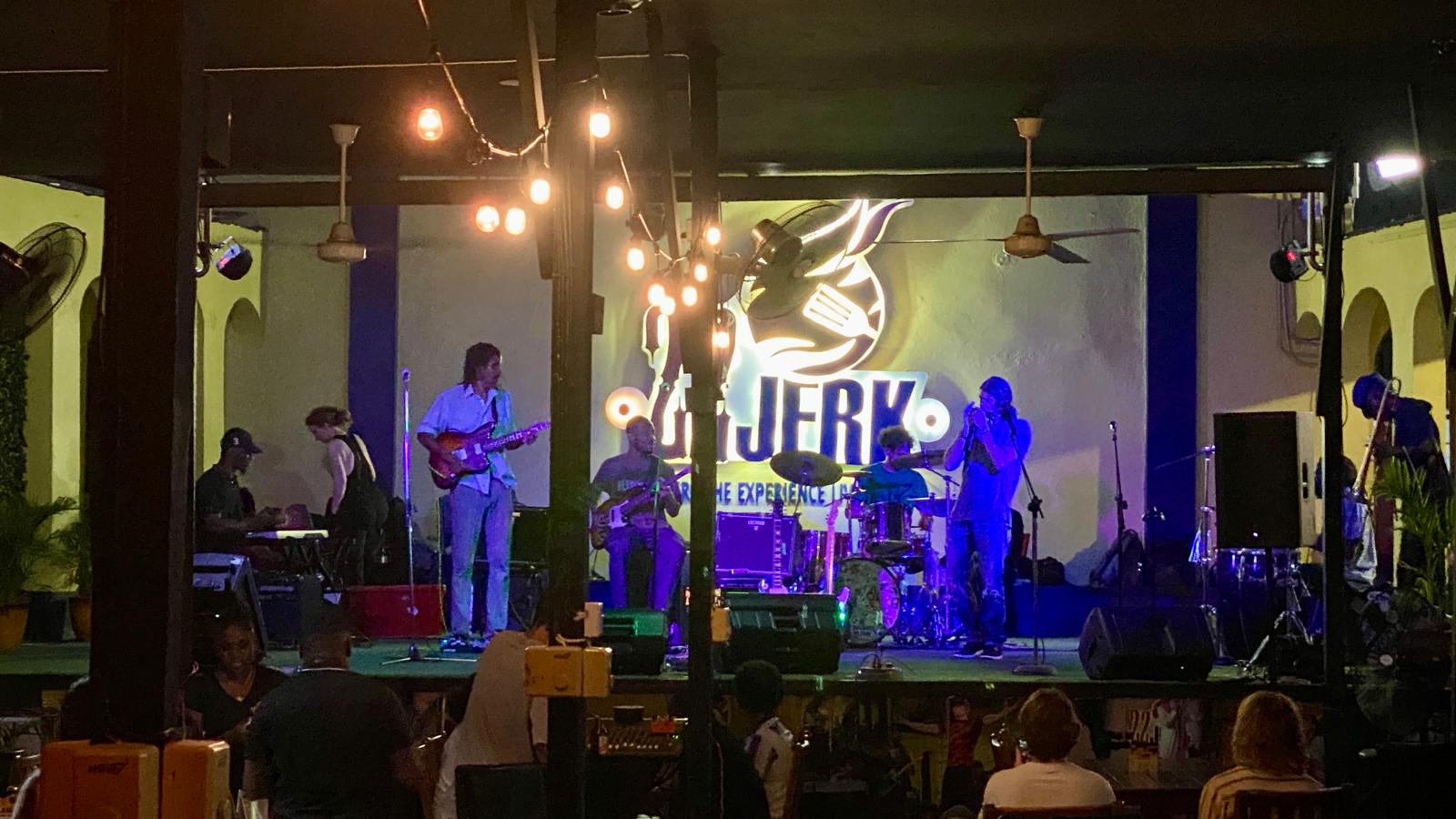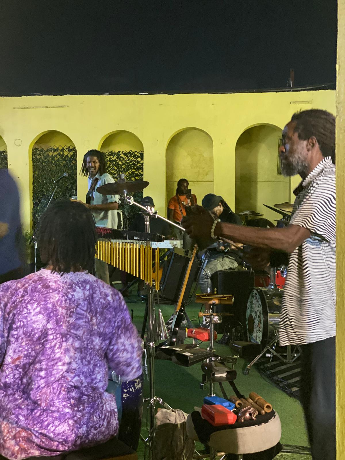 Un soir on part en ville pour un concert, on débarque au « 22 Jerk », grande salle de restauration avec une scène, un long bar, le tout abrité sous un grand toit en rôle, les murs montés jusqu’à mi-hauteur et au-dessus c’est ouvert, habillé de planches de bois, de grillage, de rubans colorés, … on vient pas là pour manger, on vient pour la musique (le menu ? pas top : jerk chicken ou jerk ribbs). Début de concert avec un groupe assez jazzy avec tendance reagge, 4-5 musiciens, un chanteur guitariste, et puis au fond de la scène, assis sur un muret, toute une bande de jeunes et de moins jeunes qui les écoute attentivement. Fin de la première partie, et puis pour la seconde, tour à tour les musiciens cèdent leur place à d’autres musiciens, à des jeunes dont c’est la première scène, à des instruments variés, ça circule, ça co-construit, ça fume aussi, ça co-fume et ça plane au son entraînant des jembés, de la basse, des percu, des cloches et du clavier. Top chouette !